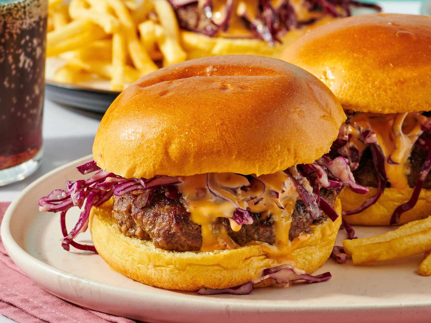 - 6Lay the bottom of the brioche buns on a work surface. Spread the bang bang sauce liberally on each bottom bun. Place the hamburger on top of the sauce, then pile the slaw on each patty.