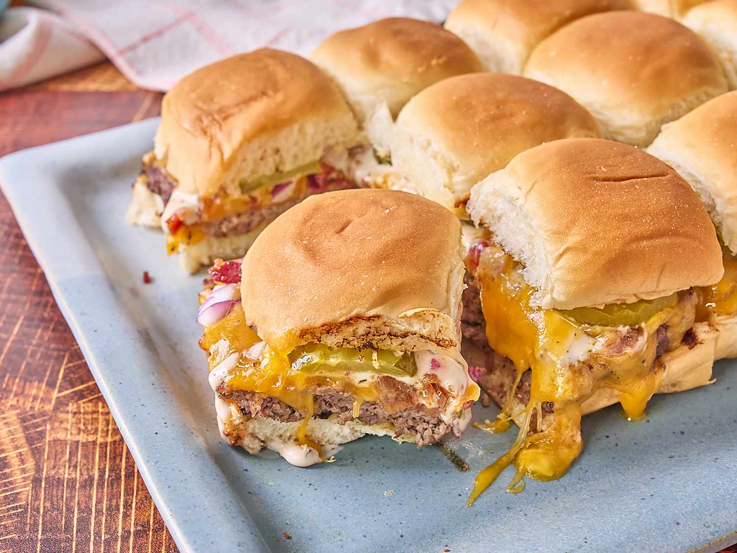 - 5Spread bottom halves of rolls with half of ranch dressing mixture. Place burgers on top and then top with chopped bacon, onion, and pickle slices. Drizzle with desired amount of remaining dressing and place bun tops on top. Cut into 12 sliders and serve.