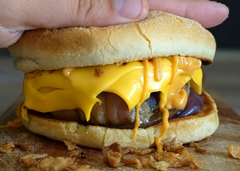 This one is built around a massive onion ring stuffed with beef and wrapped in bacon. It cooks into a juicy, smoky “bomb” with soft onion inside and crispy bacon outside, then gets finished with melted cheddar and crunchy fried onions. It’s heavy, messy, and worth it.