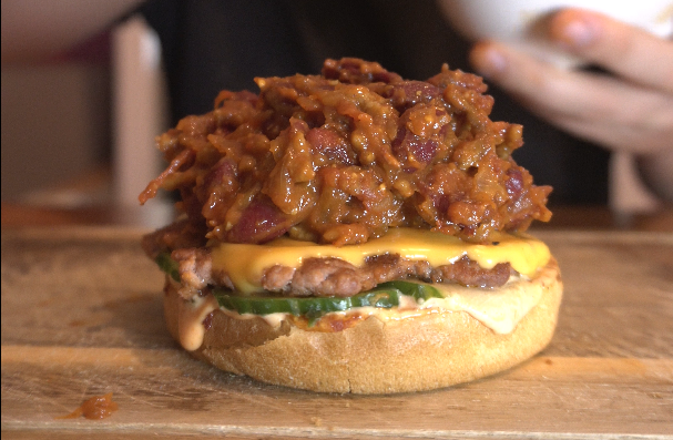 This burger is half smashburger, half sloppy joe. You start with a classic smash patty and cheese, then pile a saucy beef and bean mixture right on top. The smoky burger sauce, pickles, melted cheese, and messy sloppy filling all mix together. It's big, saucy, and absolutely not a clean burger to eat. Bring napkins.