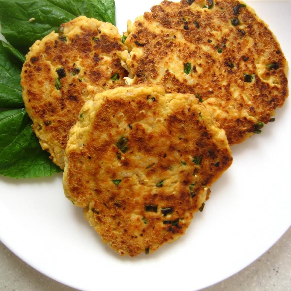 - 5Pour 1/4 inch oil into a large skillet and heat over medium-high heat. Drop tofu mixture into the skillet in six equal portions. Flatten with a spatula to form patties. Fry until golden brown, 5 to 7 minutes per side.